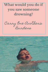 I encourage you to notice those who are nearly drowning around you. Don’t just pass them by, but reach out and lift them up. No one would have left the toddler in the lazy river! Yet, we often bypass a friend in need. Someone needs you to lighten the load. The river of life is not often lazy…it’s more like fierce, white water! Determine how you can help your burdened friend. Remember to help long enough to allow the friend to catch his or her breath. You could even ask another friend to help carry the burden, too.