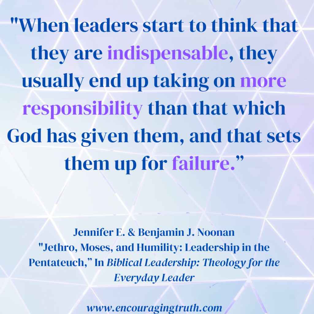 Jennifer E. Noonan and Benjamin J. Noonan focus on Moses’ humility in choosing to share the leadership responsibilities.[9] The authors state, “When leaders start to think that they are indispensable, they usually end up taking on more responsibility than that which God has given them, and that sets them up for failure.”[10]
